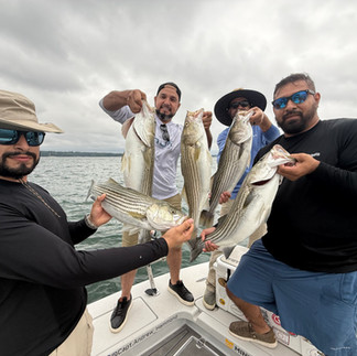 The summertime pattern has been very consistent. Downlines anywhere from the 30’ thermocline to the bottom, and freeline pitch baits while anchored with live blueback herring has been the primary pattern. We are almost always working a spoon or Captain Mack’s Super Spin bucktail jig while we have the live baits deployed. Work these artificials by power reeling them back to the boat. Power reeling is dropping your bait vertically down past the fish and/or all the way to clean bottom, then burning it back up reeling it as fast as you can. This triggers a reaction strike and can also attract the attention to your bait spread. A good tip on power reeling, stripers can swim faster than you can ever crank that lure. Have you ever watched them chase your lure all the way to the boat doing this? While you're reeling as fast as possible those fish are still in 2nd gear. Reel fast. A higher gear ratio conventional reel will help get that speed up. If you get worn out, take turns with the other anglers on the boat. It’s a lot of fun when you get bit on these. I like to use 1.5-2 oz. Captain Mack’s bucktails tipped with a soft plastic paddle tail or a blueback herring. For the spoon, an 8” Nichols Lures Ben Parker Magnum Spoon in the Shattered Glass pattern is hard to beat. Trolling has been a big player right now and will continue to produce this summer if you choose to do so. For the leadcore, 7-9 colors out with a 2 oz Captain Mack’s bucktail tipped with a soft plastic or herring has been the sweet spot.